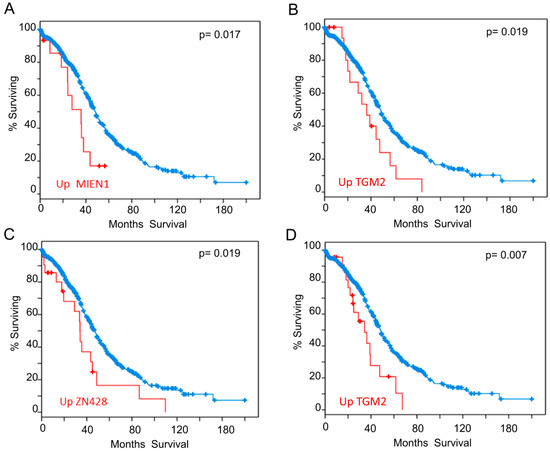 We also analyzed our interactome components (listed in Table 1 and Table 2) with the tools available in cBioportal (http://www.cbioportal.org/ accessed on 03-06-2020) [102,103] looking for correlations between expression levels and clinical outcome. To carry out this analysis, we selected samples from the study “Ovarian Serous Cystadenocarcinoma (TCGA)” with information of 606 samples from 594 patients (https://www.cbioportal.org/study/summary?id=ov_tcga. accessed on 03-06-2020). We found that patients who have higher expression of some of the genes identified in our study have lower survival expectation than the rest. Analysis of expression data based on microarray technology revealed that up-regulation of mRNA levels of MIEN1 (Figure 4A) or TGM2 (Figure 4B), negatively correlated to survival. Analysis of expression data based on RNAseq technology showed that up-regulation of ZN428 (Figure 4C) or TGM2 (Figure 4D) worsens survival outcomes. Additionally, it has also been reported that patients with RSF1 amplification or overexpression had a significantly shorter overall survival than those without [104], although for RSF1 the p-value obtained in the Logrank Test analysis did not reveal statistical significance.