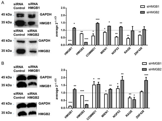Control of gene expression by HMGB1 and HMGB2 (A) in SKOV-3 cells (B) in PEO1 cells. Left panel shows the western blot confirming HMGB1 and HMGB2 silencing; complete blots and quantification are provided in Figure S3. The right panel shows relative expression of tested genes after HMGB1 or HMGB2 silencing. The dotted line indicates no variation of relative expression in the silenced line versus the line treated with cRNA, boxes upper the line show genes over-expressed in silenced cells, and those under the line are genes under-expressed in silenced cells. * (p < 0.05); ** (p < 0.01); *** (p < 0.001).