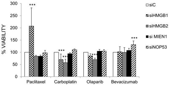 The genes HMGB1, HMGB2, MIEN1 and NOP53 were silenced by siRNA as described in Materials and Methods and the effect on cell viability after treatments with paclitaxel, carboplatin, olaparib and bevacizumab were compared in cells transfected with the corresponding specific siRNAs and siC (unrelated Control). Results are shown in Figure 6. Silencing of HMGB1 or HMGB2 diminished SKOV-3 cell viability after treatment with carboplatin. However, silencing of HMGB1 increased cell viability after treatment with paclitaxel. Cell viability after treatment with olaparib diminished with HMGB2 silencing. Finally, silencing of NOP53 increased cell viability after treatment with bevacizumab.