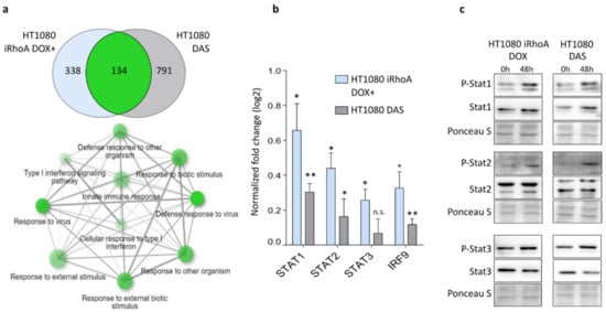 To determine amoeboid phenotype associated signalling, we analysed previously published transcriptomic data from human fibrosarcoma HT1080 cells in 3D collagen before and after MAT induced either by the expression of doxycycline-inducible constitutively active RhoA (iRhoA) or by the treatment of the cells with a Src/Abl kinase inhibitor dasatinib (DAS) []. To identify functional gene categories upregulated in amoeboid cells, we performed an enrichment analysis for Gene Ontology (GO) Biological Process terms on genes affected by both treatments []. We revealed a strong similarity in the spectra of upregulated genes to type I IFN response (Figure 1a). To affirm that type I IFN signalling is elevated in amoeboid cells, we measured the expression of genes encoding Stat transcription factors (TFs) and IRF9, a component of ISGF3, by RT-qPCR in HT1080 cells undergoing MAT induced by both iRhoA expression and DAS treatment in a 3D environment (Figure 1b). We detected significantly increased levels of STAT1, STAT2 and IRF9 transcripts after both treatments inducing MAT. Next, we determined the activation status of the corresponding Stat TF proteins measured as phosphorylation detected by immunoblotting, which revealed a predominant activation of Stat1/2 compared to Stat3, in agreement with the upregulation of type I IFN response identified in the transcriptomic data (Figure 1c).