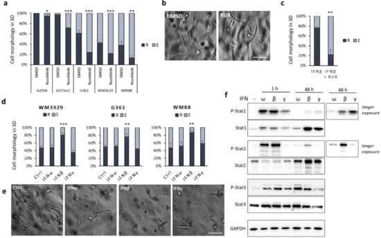Transcriptomic analysis and the subsequent data validation of genes upregulated after MAT suggested that amoeboid cells display intrinsically upregulated type I IFN signalling. To study the role of IFN signalling in invasion plasticity further, we focused on human melanoma cell lines, since they are known to exhibit high inherent invasion plasticity governed by autocrine and paracrine production of various cytokines [,,]. Initially, we tested the effect of IFN signalling suppression by Ruxolitinib, a Jak1/2 inhibitor, on a panel of amoeboid and mixed-morphology melanoma cells lines. The inhibition of Jak1/2 significantly promoted the elongated, mesenchymal migratory phenotype of five tested melanoma cell lines in 3D collagen (Figure 2a,b). Next, we tested the effect of IFN signalling activation on three selected cell lines with mixed morphology—namely WM3629, G361 and WM88. We treated the cells with IFNs of both type I (IFNω and β) and type II (IFNγ). Interestingly, IFNβ—but neither IFNω nor IFNγ—promoted the round amoeboid phenotype in all three cell lines (Figure 2d,e), and this could be blocked by Ruxolitinib (Figure 2c). To compare the activity of all three IFNs and disclose their differing effect on cell morphology, we assessed the phosphorylation levels of Stat1, 2 and 3 at different time points (Figure 2f; Figures S2a and S3). Only IFNβ induced a long-term response, observed as the prolonged phosphorylation of Stat1 and Stat2, but interestingly also as the accumulation of Stat1 and Stat2 proteins, which are known to sustain inflammatory signalling []. To exclude that the round phenotype observed in response to IFNβ is caused by the induction of apoptosis, we measured cell proliferation in the 3D collagen of untreated and treated cells and detected a decrease consistent with the anti-proliferative effects of IFNβ (Figure S2c), but no significant differences in numbers of dead cells were detected (Figure S2d). Moreover, by live cell imaging of cells in 3D collagen, we documented that IFNβ treated cells invade almost exclusively as round, amoeboid cells (Video S1).