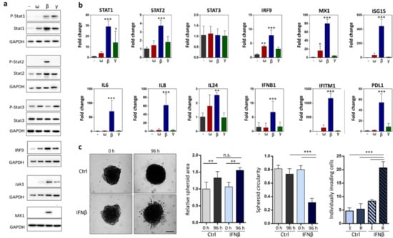 Characterization of IFN treated cells. (a) Immunoblotting detection of proteins from WM3629 cells cultured in 3D collagen for 48 h after treatment with IFNs (overall exposure to IFNs was 96 h). (b) Gene expression changes in WM3629 cells cultured in 3D collagen for 48 h (overall exposure to IFNs 96 h). (c) Spheroids of WM3629 cells, quantification of spheroid area, circularity, and the number of individually invading cells after 96 hours in 3D collagen. Scale bar 500 µm. R = round, E = elongated. p-values: *** p < 0.001, ** p < 0.01, * p < 0.05. Detailed information about Western blot can be found at Figure S5.