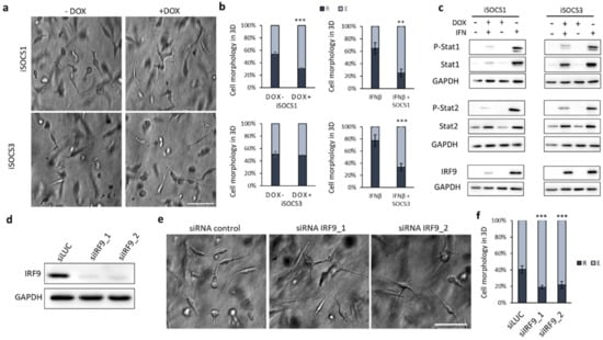 All cell lines used were of human origin and were routinely cultivated in DMEM medium supplemented by 10% FBS and 10 µg/µL ciprofloxacin (Sigma, Piscataway, NJ, USA) in a humified atmosphere with 5% CO2 at 37 °C. Transfections were performed using polyethylenimine (Polysciences, Inc., Warrington, PA, USA) or GenMute transfection reagent (SignaGen Laboratories, Frederick, MD, USA) in the case of DNA and siRNA, respectively, according to manufacturer’s protocol. Stable cell lines were prepared by lentiviral transduction using the second-generation packaging system (pLVX constructs, Tet-On Advanced Gene expression system, Clontech, Mountain View, CA, USA) and enriched by cell sorting, based on EGFP expression. In the case of IFN-treated cells used for morphology studies, RNA and protein lysates, cells were pre-treated with 10 ng/mL recombinant human IFNs (Peprotech, Cranbury, NJ, USA) for 48 hours and IFNs were also present during subsequent 3D cultures (overall exposure time 96 h). Ruxolitinib (Sigma) was used at a concentration of 10 µM, dasatinib (LC Laboratories, Woburn, MA, USA) at 1 µM and doxycycline (Sigma, Piscataway, NJ, USA) at 250 ng/mL. The siRNA sequences targeting IRF9 mRNA were: siIRF9_1: 5′-GCAGAGACUUGGUCAGGUC-3′ and siIRF9_2 5′-CACAGAAUCUUAUCACAGU-3′.