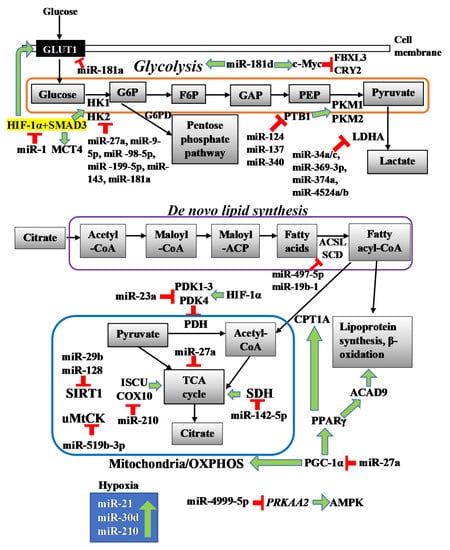 | miR-181a | Upregulation | Increase glucose uptake and lactate production | GLUT1 and HK2 via PTEN/AKT pathway | [34] |
