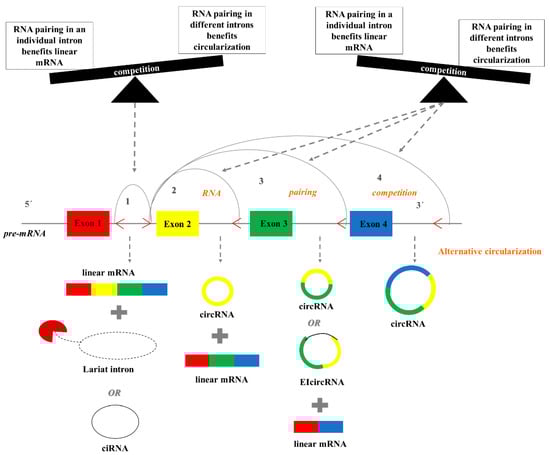 Additionally, a model of alternative circularization suggests that more than one circRNAs and linear RNAs can be generated from a single gene, via RNA-pairing competition. More specifically, complementary sequences within distinct introns favor linear mRNA generation, while complementary sequences in different introns promote circularization. The competition between these reverse complementary sequences can lead to the biogenesis of multiple alternative circRNAs (Figure 2). However, alternative circularization is a rather complicated process, in which RBPs are implicated []. Differential distribution of the complementary sequences among species suggests that alternative circularization could be species-specific.