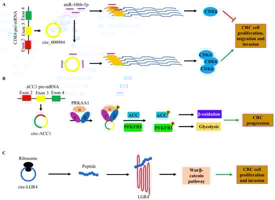 Functions of circRNAs in colorectal cancer (CRC). (A) Function as miRNA sponges. circ_000984 bears miRNA binding sites for miR-106b-5p. When circRNA is absent, the miRNA binds to the miRNA-response elements (MREs) of CDK6 mRNA, leading to decreased levels of CDK6 protein and, hence, decreased proliferation, migration, and invasion. The presence of circ_000984 impedes this regulation of CDK6 expression by sequestering miR-106b-5p. (B) Interaction with RBPs. circACC1 interacts with β and γ subunits of PRKAA1 (AMPK), leading to its stabilization and activation. PRKAA1 phosphorylates ACC and PFKFB3, leading to increased β-oxidation and glycolysis, respectively. This mechanism promotes CRC progression. (C) circRNAs can encode for peptides. circ-LGR4 encodes for a peptide, which interacts with LGR4 receptor and activates Wnt/β-catenin signaling pathway, resulting in CRC cell proliferation and invasion.