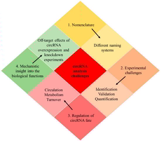 Fourthly, it is important mechanistic insights into the biological functions of circRNAs to be gained. So far, the mechanism exploration is conducted via circRNA overexpression or knockdown experiments. However, the off-target effects and the collateral impact on the linear counterpart are great challenges. Alternatively, an optimized CRISPR-Cas system would offer a more robust molecular platform to carry out these studies. Additionally, many studies focus on the function of circRNAs as miRNA sponges, ignoring the rest potential functions of circRNAs. For the characterization of circRNAs as miRNA sponges, the stoichiometric relation between these two molecules and the number of target sites of the circRNA should be taken into consideration []. A summary of the existing challenges is illustrated in Figure 4.