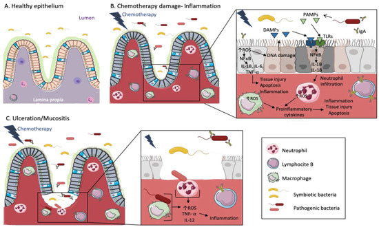 Chemotherapy treatments cause inflammation and mucositis in the intestinal epithelium of cancer patients. The cartoon representing a healthy epithelium (A) shows a wide diversity of symbiotic bacteria in the lumen and some inactive immune cells in the lamina propia. Both spaces are separated by a mucosal barrier. When patients are treated with chemotherapy (B), the mucosal barrier is damaged and pathogenic bacteria coexist with symbiotic bacteria in gut microbiota. Then, intestinal epithelial cells suffer DNA damage and tissue injury/cell apoptosis mediated by the increase of Reactive Oxygen Species (ROS) and cytokines signaling cascades. Cells affected by DNA damage release Damage-Associated Molecular Patterns (DAMPs), which together with Pathogen-Associated Molecular Patterns (PAMPs) released by pathogenic bacteria, are recognized by Toll-like receptors (TLRs). This signal is transmitted by the NFκB pathway, leading to the release of cytokines such as IL-1B, which enhance neutrophil/macrophage infiltration. ROS levels are increased in macrophages and neutrophils producing proinflammatory cytokines, tissue injury and apoptosis. On the other hand, B-lymphocytes produce IgA against the pathogenic bacteria. When the mucosal barrier is broken and the tissue injury advances (C), pathogenic bacteria interact with immune cells, increasing ROS production and provoking the activation of TNF- α as well as cytokines production, such as IL-12, also triggering inflammation.