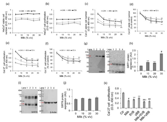 Effect of milk on cell viability, proliferation and sirtuins. Milk was centrifuged at 3000× g for 15 min at 4 °C to remove fat globules. Skimmed milk was then filtered through a 5 μm Millipore filter followed by filtration through an Amicon Ultra 0.5 mL centrifugal filter with a 3-kDa molecular weight cut-off. Before being used, milk extracts were filtered through 0.22 μm Millipore filters. Enrichment of milk was performed by adding 2 mM δVB or 2 mM γBB (a–f) Cells were treated with increasing volumes of milk (up to 30% v/v) for 0, 24, 48, and 72 h. Control cells were grown in medium containing the same volume (% v/v) of HBSS-10 mM Hepes. Cells viability and proliferation were assessed by Cell Counting Kit-8. The optical density (OD) values at time 0 h did not differ among treatments with milk (from 0 up to 30% v/v); mean values were (a) 0.483 ± 0.0097 (b) 0.298 ± 0.017, (c) 0.263 ± 0.019 (e) 0.217 ± 0.021. (g,h) SIRT1 and (i,j) SIRT6 protein expression levels in Cal 27 cells after 48 h of treatment with milk. Lane 1 = Ctr, lane 2, milk 10% v/v, lane 3 = milk 20% v/v, lane 4 = milk 30% v/v. (k) Cal 27 cell proliferation performed after 48 h of treatment with milk (30% v/v) supplemented with 2 mM δVB or 2 mM γBB. Results are expressed as arbitrary units (AU) with * p < 0.05 vs. Ctr, ** p < 0.01 vs. Ctr, # p < 0.001 vs. Ctr, ## p < 0.0001 vs. Ctr, + p < 0.05 vs. milk.