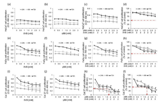 Inhibition of cell proliferation. Cell proliferation assays after exposure to different concentrations of δVB or γBB (up to 3 mM) or to δVB (2 mM) plus serial concentrations of γBB (0.5, 1, 1.5, 2, 2.5, 3 mM) cells for different times (24, 48 and 72 h) were performed in (a–d) HaCaT (e–h) FaDu and (i–l) Cal 27. The IC50 in Cal 27 cells was determined at 48 h incubation with 2 mM δVB plus 1.62 mM γBB. Control cells were grown in medium containing the same volume of HBSS-10 mM Hepes. Cell proliferation inhibition was assessed using Cell Counting Kit-8 assay. Values represent the mean±SD of four independent experiments. * p < 0.05 vs. Ctr, ** p < 0.01 vs. Ctr, # p < 0.001 vs. Ctr.