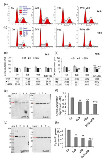 Cell cycle analysis. (a–d). Representative cell cycle analysis and average of Cal 27 cell cycle distribution. Cells were treated with vehicle (Ctr), δVB (2 mM), γBB (2.5 mM), or δVB +γBB (2 mM + 1.62 mM) for 24 h (a,c) and 48 h (b,d). Cell cycle distribution was assessed by flow cytometry collecting PI fluorescence as FL3-A (linear scale) and analysis by ModFIT software (Verity Software House, Becton Dickinson, Topsham, ME, USA). For each sample at least 10,000 events were analyzed. (e–h) Representative full-length blots of Western blotting analysis of cyclin A and cyclin B1 in cells treated for 48 h. Lane 1 = Ctr; lane 2 = δVB, lane 3 = γBB, lane 4 = δVB + γBB. Protein expression was determined after normalization with internal control (β-actin) with Image J software and quantified using β-actin. Values are expressed as arbitrary units (AU). * p < 0.05 vs. Ctr, ** p < 0.01 vs. Ctr, # p < 0.001 vs. Ctr, † p < 0.05 vs. δVB, ‡ p < 0.05 vs. γBB.