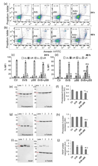 Apoptotic Cal 27 cell death. (a–d). Representative dot plots and analysis of annexin V-FITC and PI-stained cells analyzed by flow cytometry. The percentage of cells is reported in the quadrants; lower left (LL), viable cells; upper left (UL), necrotic cells; lower right (LR), early apoptotic cells; upper right (UR), late apoptotic cells. Data are expressed as mean ± SD of n = 3 experiments. At least 10,000 events were acquired. Full-length blots and protein expression levels of (e,f) procaspase-9, (g,h) procaspase-3, and (i,j) PARP from treated for 48 h with δVB (2 mM), γBB (2.5 mM), δVB +γBB (2 mM + 1.62 mM), or HBSS-10 mM Hepes (Ctr). Lane 1 = Ctr; lane 2 = δVB, lane 3 = γBB, lane 4 = δVB + γBB. Analysis of densitometric intensity was calculated with Image J software. Arbitrary units (AU) of protein expression were quantified using α-tubulin, as internal control. * p < 0.05 vs. Ctr, ** p < 0.01 vs. Ctr, # p < 0.001 vs. Ctr, † p < 0.05 vs. δVB, ‡ p < 0.05 vs. γBB.