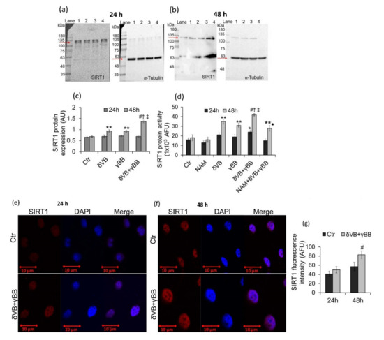 δVB and γBB induced a positive regulation of SIRT1 protein expression levels in Cal 27 cells only at 48 h (p < 0.01 vs. Ctr), with no effects observed at 24 h (Figure 5a–c). Noteworthy, SIRT1 upregulation was more pronounced following treatment with δVB + γBB (p < 0.001 vs. Ctr). Results were confirmed by measurements of SIRT1 enzyme activity (p < 0.001 vs. Ctr, p < 0.05 vs. δVB, p < 0.05 vs. γBB) (Figure 5d). Moreover, δVB + γBB-induced SIRT1 enzyme activity was reduced by cell pre-treatment with SIRT1 inhibitor, nicotinamide (NAM) (p < 0.01 vs. δVB + γBB). Upregulation of SIRT1 protein expression in Cal 27 cells treated with δVB + γBB was also confirmed by confocal laser scanning microscopy analyses (Figure 5e–g).