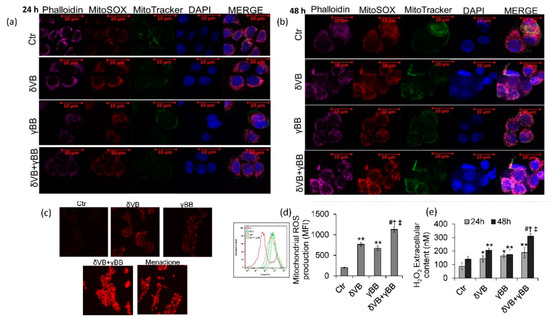 In order to better investigate the cellular events occurring during betaine-induced cytotoxicity in Cal 27 cells, chemical probes MitoSox and MitoTracker were used to evaluate the mitochondrial redox status (Figure 6a–d). Results showed that mitochondrial ROS production was activated by δVB (3.8-fold change) and γBB (3.3-fold change) (p < 0.01 vs. Ctr) starting from 24 h and continuing up to 48 h. The increase of MitoSox fluorescence was higher in cells treated with δVB + γBB (5.2-fold) (p < 0.05 vs. δVB, p < 0.05 vs. γBB, p < 0.001 vs. Ctr). These effects were accompanied by an increased extracellular ROS content, with the highest effect at 48 h of incubation with δVB + γBB (Figure 6e). In HaCaT cells, mitochondrial ROS levels were not affected by treatments (Supplementary Figure S5).