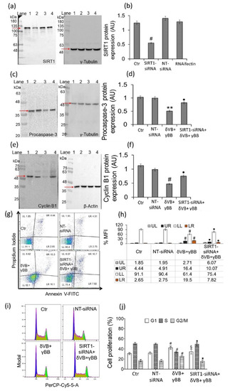 Cal 27 transient gene silencing of SIRT1. Cells were transfected with transfection reagent (RNAifectin), scramble siRNA (NT-siRNA), SIRT1-siRNA, or medium (Ctr). Treatments with betaines (48 h) were performed on transfected (SIRT1-siRNA + δVB + γBB) and non-transfected cells (δVB + γBB). After treatments, Western blots were performed to determine the expression levels of SIRT1, procaspase-3, and cyclin B1. (a,b) SIRT1 protein expression. Lane 1 = Ctr, lane 2 = SIRT1-siRNA, lane 3 = NT-siRNA, lane 4 = RNAifectin. Arrow indicates SIRT1 protein band at about 110-kDa. Nonspecific bands were detected at lower molecular weight. # p < 0.001 vs. Ctr. (c,d) Procaspase-3 protein levels. Lane 1 = Ctr, lane 2 = NT-siRNA, lane 3 = δVB + γBB, lane 4 = SIRT1-siRNA + δVB + γBB. ** p < 0.01 vs. Ctr; • p < 0.01 vs. δVB + γBB. (e,f) Cyclin B1 protein expression. Lane 1 = Ctr, lane 2 = NT-siRNA, lane 3 = δVB + γBB, lane 4 = SIRT1-siRNA + δVB + γBB. # p < 0.001 vs. Ctr, • p < 0.01 vs. δVB + γBB. (g,h) Representative dot plots of annexin V-FITC/PI-stained Cal 27 cells and percentage of apoptosis Quadrants show cell percentage; lower left (LL), viable cells; upper left (UL), necrotic cells; lower right (LR), early apoptotic cells; upper right (UR), late apoptotic cells. Fluorescent signal generated from each dye was analyzed by FlowJo software and results expressed as median fluorescence intensity (MFI). Data are expressed as mean ± SD of n = 4 experiments. At least 10,000 events were acquired. # p < 0.001 vs. Ctr, • p < 0.01 vs. δVB + γBB. (i,j) Representative cell cycle dot plots and analysis. Cell cycle distribution was assessed by flow cytometry collecting PI fluorescence as FL3-A (linear scale) and analyzed by ModFIT software (Verity Software House). # p < 0.001 vs. Ctr, • p < 0.01 vs. δVB + γBB, § p < 0.05 vs. δVB + γBB.