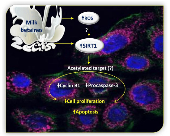 Schematic representation of cellular events induced by milk betaines in Cal 27 cells. Dietary betaines, δVB and γBB, cause inhibition of cell proliferation and induction of apoptosis. Pure betaines determine an increase in the accumulation of mitochondrial ROS which directly or indirectly influences the nuclear expression of SIRT1. Up-arrow, increase; down-arrow, decrease; question mark, unknown.