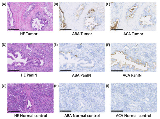 2.2. The ABA- and ACA-Positive Glycans are Strongly Localized in the Pathological Lesion of PC