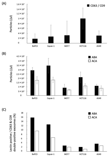 2.3. Quantification of the ABA- and ACA-Positive EVs Derived from Cancer Cell Lines with ExoCounter
