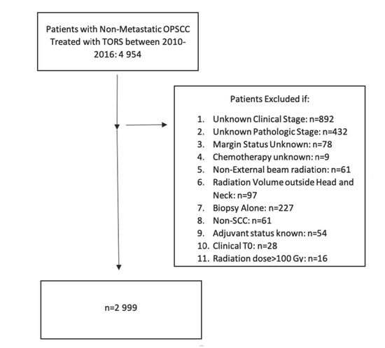 - Bates, J.E.; Hitchcock, K.E.; Mendenhall, W.M.; Dziegielewski, P.T.; Amdur, R.J. Comparing national practice versus standard guidelines for the use of adjuvant treatment following robotic surgery for oropharyngeal squamous cell carcinoma. Head Neck 2020, 42. [Google Scholar] [CrossRef] [PubMed]