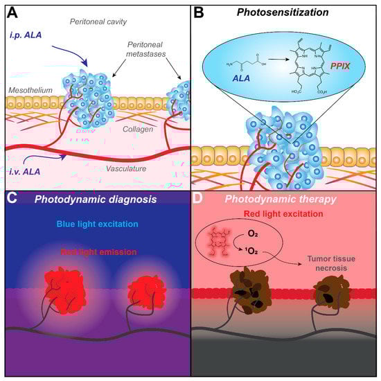 Fluorescence identification of peritoneal carcinomatosis (PCAR) by photodynamic diagnosis (PDD) and its subsequent treatment with photodynamic therapy (PDT), exemplified with ALA as a photosensitizer. (A) The photosensitizing agent ALA can be administered via either intraperitoneal (i.p.) or oral administration (i.v.) and accumulates in cancer tissues. (B) In cancer cells, ALA is preferentially metabolized to form PpIX, a fluorescent photosensitizer. (C) Under blue light, PpIX is excited and emits red fluorescence. Its detection can guide the surgical resection of the fluorescent tissues. (D) By exciting PpIX, for example with red light, reactive oxygen species such as 1O2 are formed through photochemical reactions and energy transfer. These cause oxidative damage to vital cellular components such as lipids, proteins and nucleic acids, culminating in massive tumor cell death.