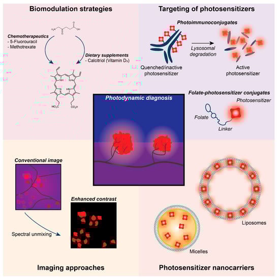 Promising strategies to improve the efficacy of PDD for PCAR. Innovative approaches have demonstrated the promise of biomodulation strategies in augmenting PpIX biosynthesis in cancer cells, in the targeting of photosensitizers, in the development of nanocarriers, and in improving imaging techniques.