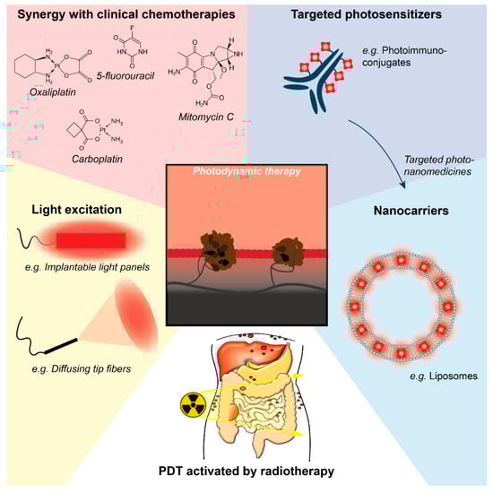 Although PDT has seen limited clinical success, various preclinical studies have demonstrated promising results with diverse photosensitizers [88,90]. In the section below, we highlight several promising studies in which some of the identified challenges were tackled through the development of targeted PDT strategies, combinations of PDT with clinically-used chemotherapeutics, and innovative photosensitizer excitation methods (Figure 3).
