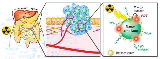 Although PCAR lesions are superficial and the limited penetration of light is not a major limiting factor for the treatment of well-identified and accessible metastases, a major challenge lies in the treatment of undetectable microscopic disease or tumors that are optically shielded by organs and that strongly affect the overall survival of the patients. Secondly, it is difficult for light to homogeneously excite photosensitizers throughout the whole abdominal cavity. To tackle these challenges, a novel approach to induce PDT by X-ray radiation has recently emerged. Because tissues are nearly transparent to X-rays, this strategy enables the remote excitation of photosensitizers, in a non-invasive way and potentially within the entire peritoneal cavity during the course of radiotherapy (Figure 4). This technology relies on exciting nanoparticles, which are capable of down-converting ionizing radiations, such as X-rays, into visible light [104]. When conjugated to photosensitizers, nanoscintillators can convert the X-rays used in radiotherapy into visible light that can subsequently excite the photosensitizers. Encouraging results demonstrating the ability of this X-PDT strategy have been obtained in vitro and in vivo, which have been recently reviewed [105,106,107,108,109,110].