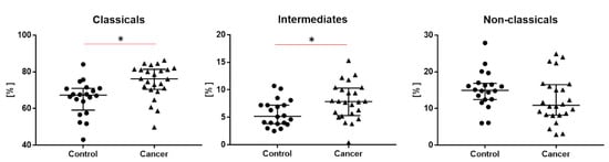 We observed the highest proportion of the classical monocytes, a lower proportion of the non-classical monocytes and the lowest proportion of intermediate monocytes in both groups. We noticed a significantly higher proportion of classical monocytes (76.2 vs. 67.3, p < 0.05) and a higher proportion of intermediate monocytes in the lung cancer group than the in control group (7.9 vs. 5.2, p < 0.05) (Table 2 and Figure 2).