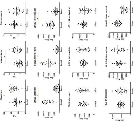 The differences between cancer group and study group for geometric means expression of CD62L, CD11c and HLA-DR on classical, intermediate, and non-classical monocytes. Graphs show the median values and quartile Q1–Q3 * p < 0.05.