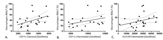 There were positive correlations between CD11c expression on classical monocytes with macrophages in clBALF (R = 0.43, p < 0.05) and CD11c expression on intermediates monocytes with macrophages in clBALF (R = 0.43, p < 0.05). We also observed a positive correlation between HLA-DR expression on intermediates monocytes and macrophages in clBALF (R = 0.45, p < 0.05) (Figure 4). We did not observe any correlation between any subsets of monocytes with macrophages from hlBALF.