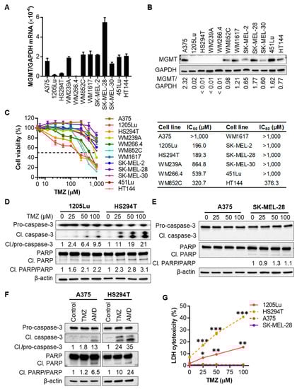 Melanoma cell lines with low expression levels of O6-methylguanine-DNA methyltransferase (MGMT) are sensitive to temozolomide (TMZ). (A) qRT-PCR analysis of MGMT mRNA expression in a panel of 12 human metastatic melanoma cell lines. (B) Western blot analysis of MGMT protein expression in 12 metastatic melanoma cell lines. The band densities of MGMT were digitally quantitated and normalized to those of the corresponding glyceraldehyde-3-phosphate dehydrogenase (GAPDH) in each cell line. (C) Melanoma cell viability evaluated by 3-(4,5-dimethylthiazol-2-yl)-5-(3-carboxymethoxyphenyl)-2-(4-sulfophenyl)-2H-tetrazolium (MTS) assay after the treatment with a single dose of TMZ at 0-1 mM for 72 h. Fifty percent inhibitory concentration (IC50) values were calculated using GraphPad Prism software. (D) Western blot analysis of caspase-3 cleavage and Poly(ADP-ribose) polymerase (PARP) cleavage indicated by the presence of cleaved (17, 19 kDa) caspase-3, and cleaved (89 kDa) PARP, respectively, in 1205Lu and HS294T cells treated with TMZ at 0–100 µM for 48 h. The band densities of cleaved caspase-3 and PARP were digitally quantitated and normalized in each cell line to those of the corresponding pro-forms subjected to the same treatment. (E) Western blot analysis of caspase-3 and PARP cleavages in A375 and SK-MEL-28 cells. (F) Western blot analysis of caspase-3 and PARP cleavages in A375 and HS294T cells treated with 100 µM TMZ for 48 h or apoptosis inducer actinomycin D (AMD; 10 µM) for 6 h. (G) Lactate dehydrogenase (LDH) release into culture medium measured using a colorimetric assay as a marker of cell death after TMZ treatment for 48 h. Data are representative of two independent experiments, and are expressed as the mean ± SEM (n = 3–4). * p < 0.05, ** p < 0.01, and *** p < 0.001 vs. the corresponding vehicle control.