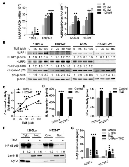 We tested the TMZ effects on inflammasomes in TMZ-sensitive 1205Lu and HS294T cells. When they were treated with one dose of TMZ for 48 h, we observed a significant increase in mRNA and protein expression of inflammasome sensors NLRP1 and NLRP3, as well as the cleavage of inflammasome effector caspase-1 in both cell lines (Figure 2A,B and Figure S5). In contrast, TMZ had little to no impact on NLRP1 and NLRP3 expression, as well as caspase-1 cleavage in TMZ-resistant A375 and SK-MEL-28 cells (Figure 2B and Figure S5). Because both NLRP1 and NLRP3 form inflammasomes upon activation, we then tested whether TMZ induces inflammasome activation. Following TMZ treatment for 48 h, caspase-1 activity (Figure 2C) and IL-1β secretion (Figure 2D) were increased in both cell lines. These results demonstrate that TMZ enhances NLRP1 and NLRP3 expression, activates NLRP inflammasomes, and induces IL-1β secretion in MGMT-low human melanoma cells.