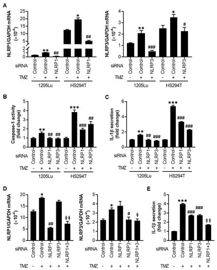 Effects of NLRP1 and NLRP3 small interfering RNAs (siRNAs) on inflammasome activation. Cells were transfected with siRNA control (siControl), siNLRP1, and/or siNLRP3 (40 nM each) for 18 h, then treated with 100 μM TMZ. (A) qRT-PCR analysis of NLRP1 (left) and NLRP3 (right) in 1205Lu and HS294T cells at 24 h after treatment with TMZ. (B) Caspase-1 activity and (C) IL-1β secretion in 1205Lu and HS294T cells at 48 h after treatment with TMZ. (D) qRT-PCR analysis of NLRP1 and NLRP3 in HS294T cells at 24 h after TMZ treatment. (E) IL-1β secretion in HS294T cells at 48 h after TMZ treatment. Data are expressed as the mean ± SEM (n = 3–4). * p < 0.05, ** p < 0.01, and *** p < 0.001 vs. the corresponding vehicle control plus negative control siRNA (A–E). # p < 0.05, ## p < 0.01, and ### p < 0.001 vs. the corresponding negative control siRNA plus TMZ treatment (A–E). ǂ p < 0.05 and ǂǂ p < 0.01 vs the corresponding either siNLRP1 or siNLRP3 (D) or both siNLRP1 and siNLRP3 (E).