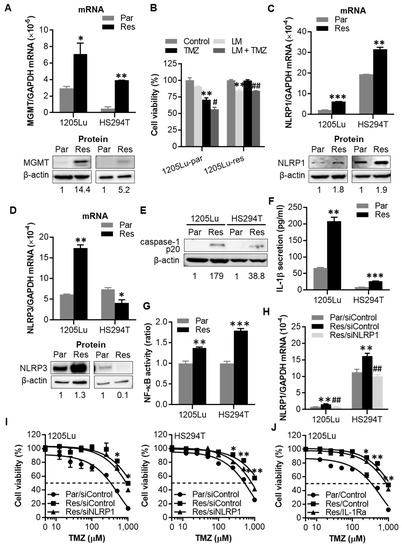 TMZ-resistant cells show increased NLRP1 expression and IL-1β secretion levels. Resistant 1205Lu and HS294T cells were generated after exposing cells to stepwise increasing doses of TMZ (50–200 μM for 1205Lu and 25–100 μΜ for HS294T) over two months. (A) qRT-PCR analysis of MGMT mRNA expression (upper panel) and Western blot analysis of MGMT protein expression (lower panel) in resistant cells. (B) Cell viability of 1205Lu parental and resistant cells evaluated by MTS assay after the treatment with a single dose of TMZ and/or a single dose of the MGMT inhibitor Lomeguatrib (LM) for 72 h. (C) NLRP1 mRNA (upper panel) and protein (lower panel) expression, (D) NLRP3 mRNA (upper panel) and protein (lower panel) expression, (E) caspase-1 cleavage, (F) IL-1β secretion, and (G) NF-κB activity of resistant 1205Lu and HS294T cells. (H) NLRP1 mRNA expression in parental and resistant 1205Lu and HS294T cells at 24 h after transfection with siNLRP1. (I) Cell viability of parental and resistant 1205Lu (left) and HS294T (right) cells after NLRP1 knockdown for 18 h and then TMZ treatment for 72 h. (J) Cell viability of resistant 1205Lu cells after daily treatment with IL-1Ra (10 μg/mL) for 72 h. Parental and resistant cells are indicated by “Par” and “Res”, respectively. In (I,J), dashed lines indicate the 50% inhibitory concentrations (IC50) of TMZ. Data are representative of three independent experiments, and are expressed as the mean ± SEM (n = 3-4). * p < 0.05, ** p < 0.01, and *** p < 0.001 vs the corresponding parental cells (A),(C),(D),(F),(G), the corresponding control cells (B), the Res/siControl cells (I), or the Res/Control cells (J). # p < 0.05 and ## p < 0.01 vs the TMZ alone cells (B) or the Res/siControl cells (H).