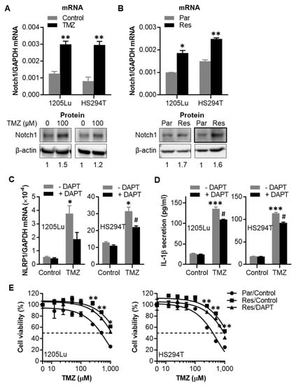 Notch signaling is involved in crosstalk with other oncogenic signaling pathways, including IL-1β and NF-κB, and plays a role in tumor survival and chemoresistance [30,31]. We found that a single dose of TMZ treatment enhanced the mRNA and protein expression of Notch1 in 1205Lu and HS294T parental cells (Figure 5A and Figure S17). Similarly, Notch1 expression levels were found to be upregulated in TMZ-resistant cells (Figure 5B and Figure S18).