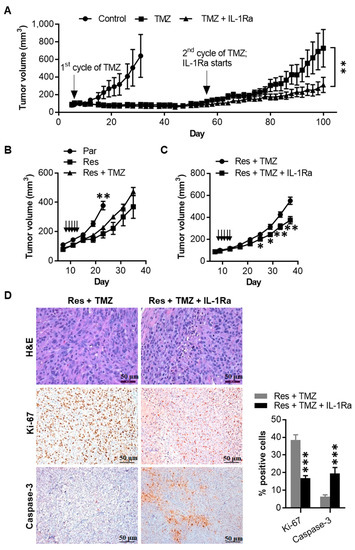 IL-1Ra inhibits TMZ-resistant 1205Lu tumor growth in vivo. (A) Tumor growth curve of 1205Lu parental cells subcutaneously injected in mice, treated with a TMZ cycle or 10% DMSO (Control) intraperitoneally (indicated by arrow), and further treated with a second cycle of TMZ together with saline or IL-1Ra (daily subcutaneous injection, starting with the second cycle of TMZ and being kept until the end of the experiment on day 100). Data are expressed as the mean ± SEM. n = 4 tumors (Control), 10 tumor (TMZ), or 10 tumors (TMZ + IL-1Ra). (B) Tumor growth curve of 1205Lu parental cells (Par), resistant cells (Res) injected subcutaneously in mice, treated with a cycle of TMZ or 10% DMSO as vehicle control (daily intraperitoneally for five days, indicated by arrows). Tumor growth was monitored for 23 or 35 days (parental or resistant tumors, respectively). Data are expressed as the mean ± SEM. n = 8 tumors per each group. (C) Tumor growth curve of 1205Lu resistant cells (Res) injected subcutaneously in mice, treated with a cycle of TMZ (daily intraperitoneally for five days, indicated by arrows) together with saline or IL-1Ra (daily subcutaneously, starting with TMZ and being kept until the end of the experiment on day 37). Data are expressed as the mean ± SEM. n = 8 tumors (Res + TMZ) or 14 tumors (Res + TMZ + IL-1Ra). (D) Staining of tumor sections from (C) tumors with hematoxylin and eosin (H&E) (upper panel), Ki-67 (middle panel), and caspase-3 (lower panel). Ki-67-positive cells and caspase-3-positive cells were counted in the whole field under a microscope and presented as % positive tumor cells. Bar = 50 μm (H&E) or 100 μm (Ki-67 and caspase-3). Representative images are shown or data are expressed as the mean ± SEM (n = 5). * p < 0.05, ** p < 0.01, and *** p < 0.001 vs the corresponding or indicated tumors (A,C,D) or the combined resistant tumors at the same time point (B).