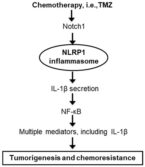 Strategies to overcome drug resistance and enhance drug sensitivity include combination therapies using agents that target known resistance mechanisms. TMZ has been combined with inhibitors that target not only MGMT [15], NF-κB [13], and Notch signaling [39] but also AKT [44], mTOR signaling [45], autophagy [46,47], and glutaminase-mediated glutamine metabolism [48], all of which significantly enhanced TMZ cytotoxicity in melanoma cells. Additional work in glioma demonstrated improved therapeutic results from the concurrent use of TMZ and c-Jun N-terminal kinase inhibitors [49]. Cytokines can also be used to overcome drug resistance. A tumor suppressor cytokine IL-24 is downregulated during melanoma progression, and supplementing IL-24 has shown to reverse melanoma resistance to TMZ by downregulating p53 and MGMT activity [25]. Our current work on NLRP1 would, therefore, add another therapeutic target to the list. Notch pathway inhibitors, including γ-secretase inhibitor, Notch 1 siRNA, and monoclonal antibodies against Notch receptors and ligands, are currently in clinical trials for numerous cancers [41]. Because NLRP1 expression and IL-1β secretion are downstream mediators of TMZ-induced Notch activation (Figure 8), inhibiting NLRP1 and/or IL-1β could be used to regulate cancer aggressiveness and drug resistance, as we have shown in the current study.