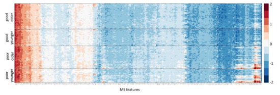 Heatmap of the natural logarithm of features used in the test. Samples in the development cohort are shown as rows, grouped by test classification (good or poor) and age category (younger (age ≤ 55) and older (age ≥ 56)). Mass spectral features are shown as columns. Features and samples are hierarchically clustered.