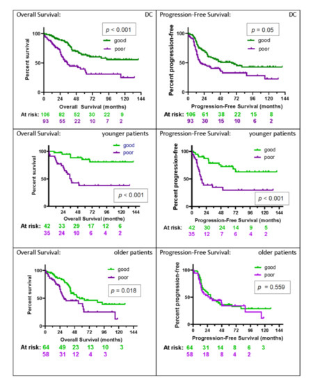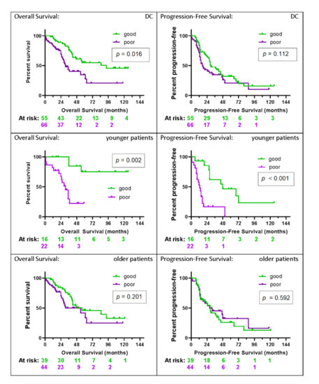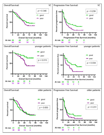 Kaplan–Meier plots for OS and PFS for the VC, as well as the subgroups of younger and older patients, are shown in Figure 4. Younger patients (age ≤ 55; n = 58) had significantly longer OS and PFS if classified as good (p = 0.015 and p = 0.034, respectively), with substantial effect sizes for each (hazard ratios OS: HR 0.31 (95% CI: 0.12–0.79); PFS: HR 0.48 (95% CI: 0.25–0.95)). In contrast to the poor group, with one-, two-, and five-year survival rates of 97%, 85%, and 43% and a median OS time of 53 (95% CI: 44-undefined) months, the values for the good group were 96%, 96%, and 80%, with the median OS not reached. Median PFS was 19 (95% CI: 9–32) months and 57 (95% CI: 20-undefined) months in the poor and good group, respectively. PFS rates at six and 12 months were 94% and 58%, respectively, for the poor group, and 96% and 84%, respectively, for the good group.