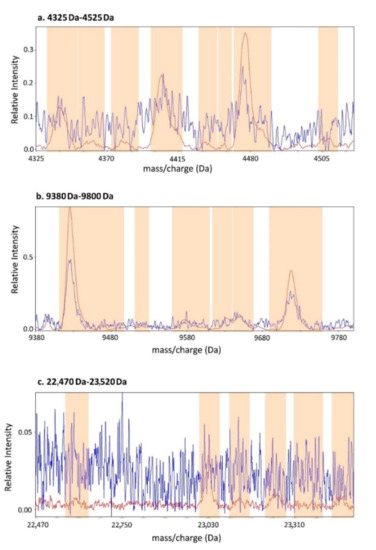 Comparison of a conventional MALDI spectrum with a Deep MALDI spectrum. A 2400-shot conventional spectrum (blue) and a 400,000-shot Deep MALDI spectrum (red) for a sample in the development cohort are shown for three regions of the mass spectrum: (a) 4325–4535 Da, (b) 9380–9800 Da, and (c) 22,470–23,520 Da. The orange bands show the locations of mass-spectral features.