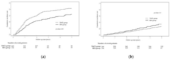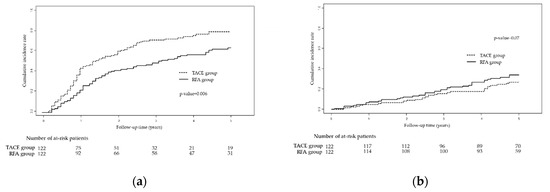 Similar results were also reproduced for recurrence; the RFA group had a better 5-year RFS rate than the TACE group (Figure 2a; 36.0% vs. 20.1%; p = 0.006). The cumulative probabilities of recurrence at 1, 3, and 5 years in the TACE group were 43.9%, 71.7%, and 79.9%, respectively, whereas those in the RFA group were 22.2%, 49.1%, and 64.0%, respectively (Figure 2a).