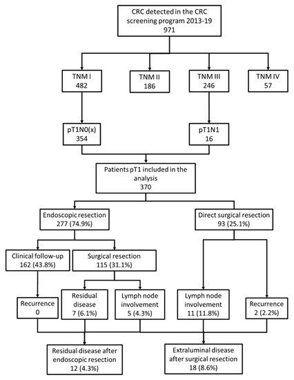 - Senore, C.; Giovo, I.; Ribaldone, D.G.; Ciancio, A.; Cassoni, P.; Arrigoni, A.; Fracchia, M.; Silvani, M.; Segnan, N.; Saracco, G.M. Management of Pt1 tumours removed by endoscopy during colorectal cancer screening: Outcome and treatment quality indicators. Eur. J. Surg. Oncol. 2018, 44, 1873–1879. [Google Scholar] [CrossRef]