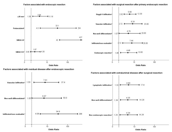 After the endoscopic resection, the patients had a median follow-up of 24.4 months (IQR 17.2–31.8). During this period, nine (3.2%) died. No recurrence was detected in the patients with an initial endoscopic resection. In the patients that required surgery, a residual disease in the intestinal wall was detected in seven (6.1%) and lymph node involvement in five (4.3%) patients with an overall rate of residual disease of 4.3% (Figure 1). The risk of residual disease in the patients that underwent surgery was 10.4%. As we show in Table 3, only three variables were independently related to the risk of residual disease after endoscopic resection: an infiltrated/nonevaluable resection border (OR 34.9, 95% CI 4.08–298), a non-well-differentiated histology (OR 6.67, 95% CI 1.05–50.0) and the vascular infiltration of the submucosa (OR 7.61, 95% CI 1.55–37.4) (Figure 2).