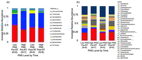 Gut microbial taxa at the phylum (a) and genus (b) level by time (pre-RT vs. post-RT) and PNS levels (low vs. high). All the microbial phyla and top 20 genera are displayed. PNS, psychoneurological symptoms; RT, radiation therapy.