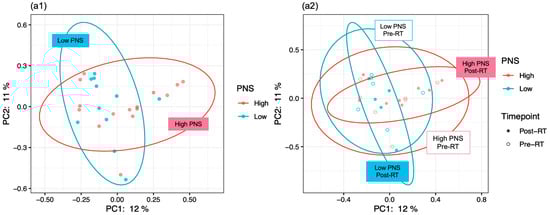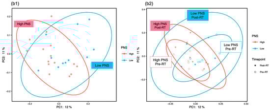 The β-diversity of gut microbiome by PNS level (low vs. high) pre-RT, post-RT, or the combination of both. (a1) and (b1) display the dissimilarities of gut microbiome via PNS levels (low vs. high) using the Bray-Curtis and weighted UniFrac distance. (a2) and (b2) display the dissimilarities of gut microbiome via PNS levels (low and high) vs. timepoint (pre-RT and post-RT) using Bray-Curtis and weighted UniFrac distance. PNS, psychoneurological symptoms; RT, radiation therapy.
