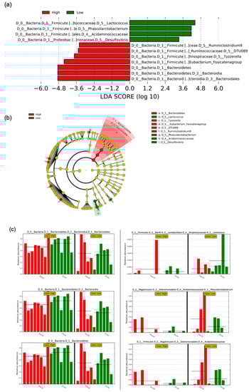 The linear discriminant analysis (LDA) effect size (LEfSe) approach was used to compare taxa differences between low and high levels of PNS cluster (Figure 3) controlling timepoint. With an LDA score that exceeded a threshold of 2.0, we obtained relatively-consistent results as our above-described longitudinal abundance analysis. After adjusting for the time (pre-RT vs. post-RT), both the cladogram (Figure 3b) and LDA bar graph (Figure 3a,c) showed that the high PNS cluster was more abundant with one phylum (Bacteroidetes), one order (Bacteroidales), one class (Bacteroidia), and four genera (Ruminiclostridium9, Tyzzerella, Eubacterium_fissicatena group, and DTU089) compared to the low PNS cluster, while the low PNS cluster was more abundant with one family (Acidaminococcaceae) and three genera (Lactococcus, Phascolarctobacterium, and Desulfovibrio) compared to the high PNS cluster.