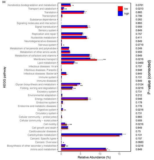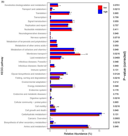 Functional pathway analysis of the gut microbiome based on PNS level (low vs. high). Based on the KEGG pathway, significant metabolism pathways are presented adjusting by the Benjamini–Hochberg method. (a) indicates all the 41 pathways based on KEGG annotations and (b) presents 31 pathways based on KEGG annotations using mean abundance larger than 5%. PNS, psychoneurological symptoms; KEGG, Kyoto Encyclopedia of Genes and Genomes. * p < 0.10; ** p < 0.05.