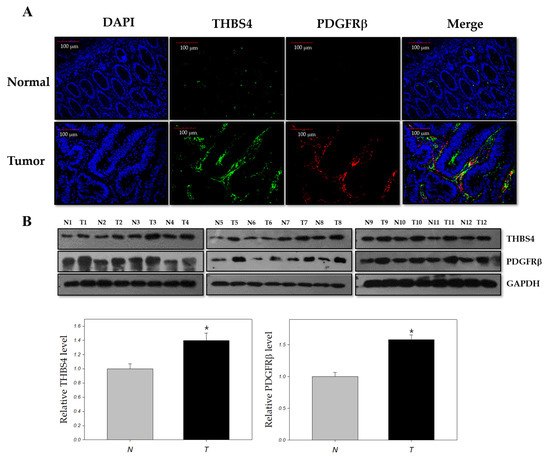There is increasing evidence that THBS4 and PDGFRβ are associated with tumor development [10,11,12,13,16,20,21,22,23,24,25,26]. To investigate the association between these two proteins in the tumor, we performed co-immunofluorescence and Western blot analyses for THBS4 and PDGFRβ in tumor tissues of patients with CRC. Compared to normal tissues, elevated levels of PDGFRβ and THBS4 were found in tumor tissues, which confirms our hypothesis that these two proteins are significantly associated with tumor development in CRC (Figure 1 and Figure S1).