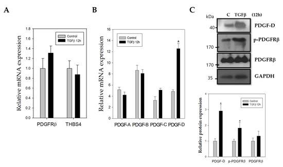 Effect of TGFβ on mRNA levels of THBS4, PDGFRβ, and PDGFRβ ligands. Relative mRNA expression levels as determined with real-time polymerase chain reaction (PCR) for (A) PDGFRβ, THBS4, (B) PDGF-A, PDGF-B, PDGF-C, and PDGF-D of DLD-1 cells cultured in the presence (TGFβ 10mM) or absence (control) of TGFβ for 12 h. (C) Western blot with anti-PDGF-D, p-PDGFRβ, and PDGFRβ antibodies in DLD-1 cells cultured in the presence (TGFβ 10 μM) or absence (control) of TGFβ for 12 h. Three independent experiments were performed in duplicate. * p < 0.05 when compared with the control t-test.
