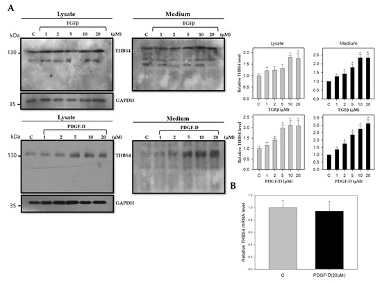 Effect of TGFβ or PDGF-D on THBS4 of lysate and cultured medium of DLD-1 cells. (A) Western blot with anti-THBS4 antibody in whole cell lysate (left panel) or cultured medium (right panel) of DLD-1 cells cultured in the presence of TGFβ (1, 2, 5, 10 and 20 μM) for 20 h or PDGF-D (1, 2, 5, 10, and 20 μM) for 8 h. (B) Relative mRNA expression levels as determined with real-time polymerase chain reaction (PCR) for THBS4 of DLD-1 cells cultured in the presence (black) or absence (gray) of PDGF-D (20 μM) for 8 h. Three independent experiments were performed in duplicate. * p < 0.05 when compared with the control t-test.